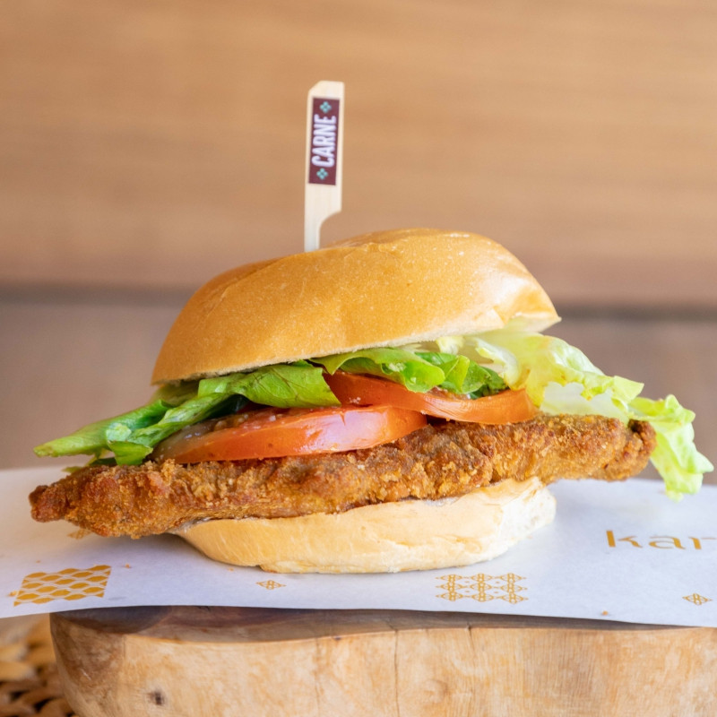 Ingredientes: Pan lactal, milanesa frita, salsa golf Karu, lechuga arrepollada y tomate.