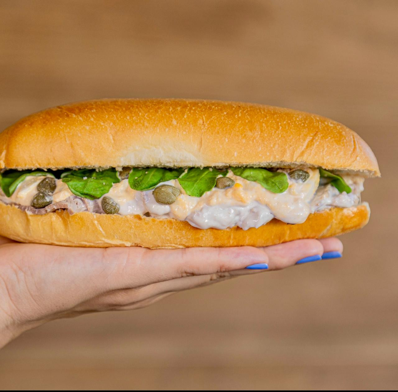Ingredientes: Peceto, salsa vitel tone, alcaparracas, huevo duro, rúcula, pan brioche.