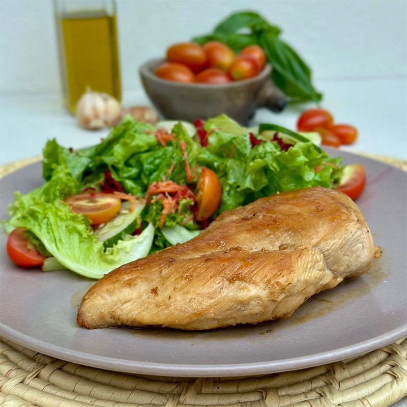 Tierna pechuga de pollo sazonada con una pizca de salpimienta y ajo, grillada hasta el dorado perfecto, equilibrada con ensaladita que te dejará sintiéndote lleno de energía y vitalidad.