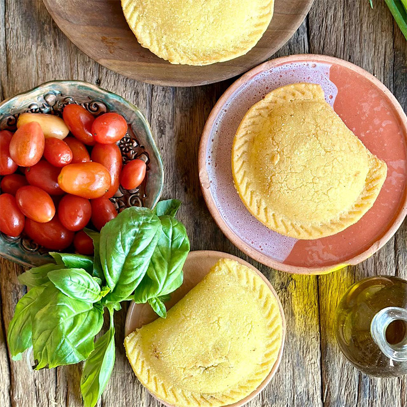 Ingredientes: Mandioca molida, harina de maíz, harina de mandioca, almidón refinado, manteca, sal, huevo. Relleno: pescado de río, sofrito de cebolla, morrones, ajo, tomate, orégano, comino, sal, pimienta, pimentón ahumado perejil ciboule y ajo.